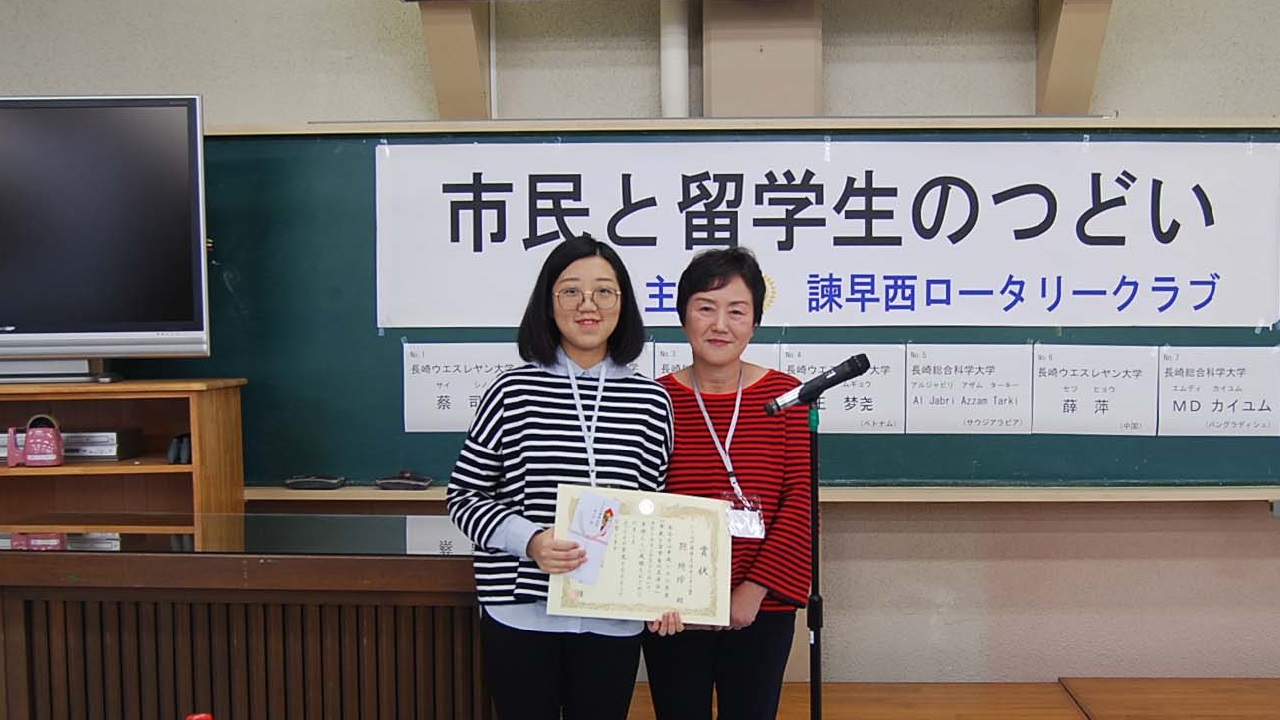 いさはや国際交流センター賞 オウ ムギョウさん(中国)長崎ウエスレヤン大学